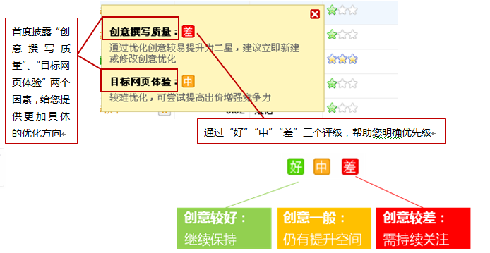 如果您選擇的是創意優選,系統會選擇用戶比較關注的那條創意,優先展現,從而吸引更多潛在受眾點擊您的推廣信息,提高點擊率,改善質量度。