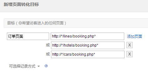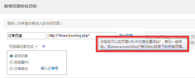 添加目標頁面http://*/lines/booking.php* 紅色框里,說明了url的填寫方法:你現在可以在頁面URL中任意位置添加*,表示一組網址,如www.a.com/bbs/* 標識bbs目錄下的所有頁面。