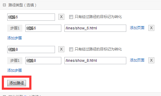 如我們的線路中有兩條線路/lines/show_6.html /lines/show_8.html是我們的重點線路,我們想記錄從這兩個線路頁面到線路訂購頁面的轉化。此時,下面的路徑類型就我們要設置的重點: