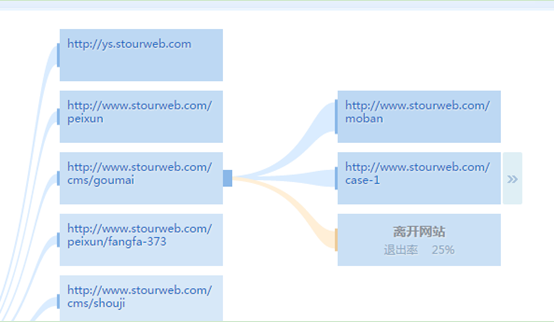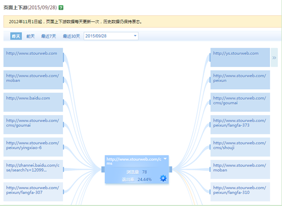 通過頁面上下游,我們可以設(shè)置需要分析的頁面,獲知他們的來路以及流量從這個(gè)頁面分發(fā)后又進(jìn)入了哪些頁面。